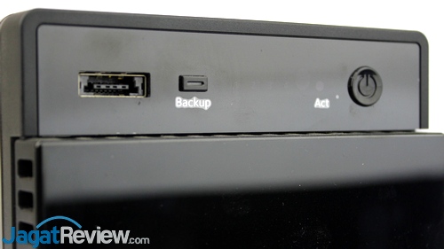 Terdapat satu konektor eSATA lain di bagian depan perangkat, dekat dengan tombol “Backup”. Konektor tersebut juga tetap dapat digunakan untuk menghubungkan Expansion Chassis 5-bay. Masih di bagian yang sama, tetapi di sisi yang berlainan, terdapat tombol power utama dari perangkat.