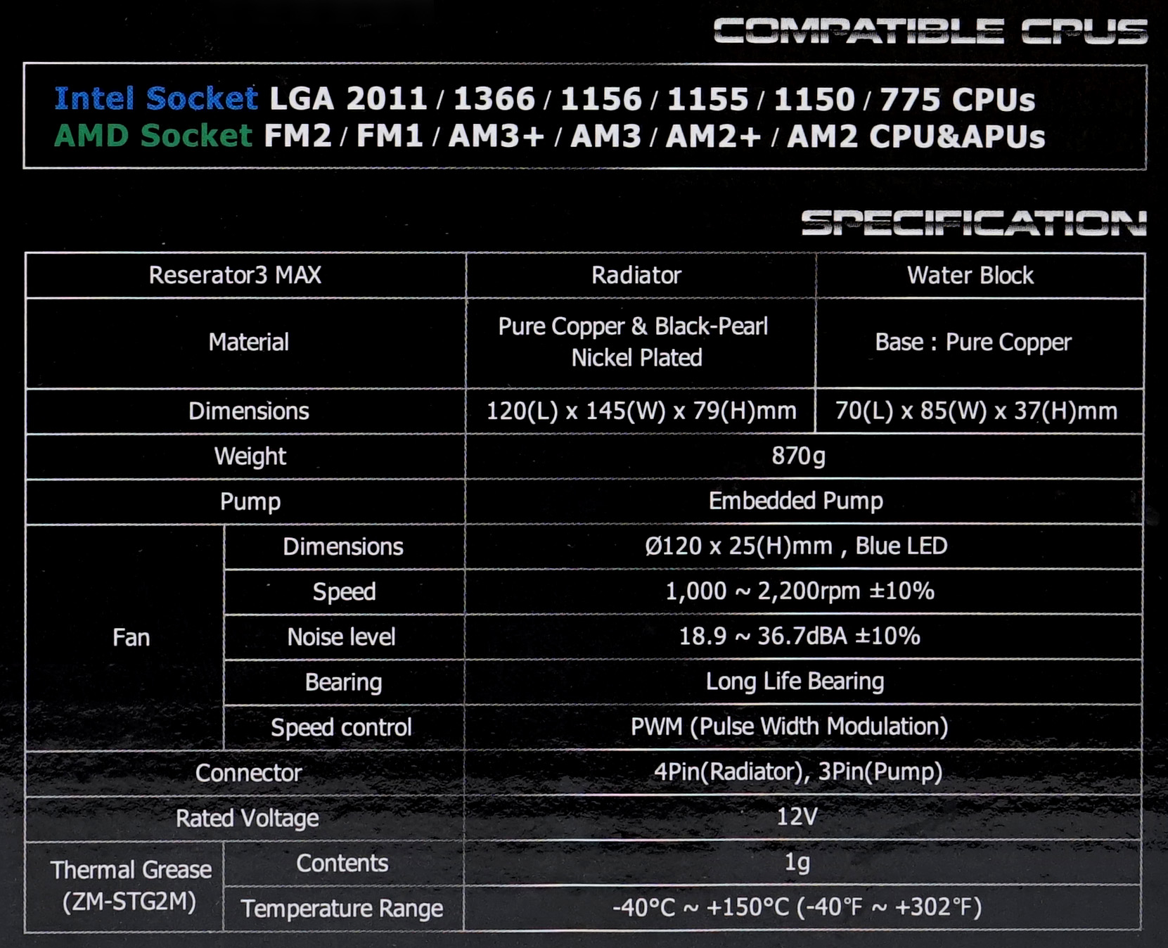 Waterblock Zalman Reserator 3 Max hadir dengan pompa terintegrasi di dalam waterblock yang pada umumnya digunakan pada desain sebuah watercooling AIO. Untuk konektor power pompa, watercooling AIO ini menggunakan konektor fan 3-pin. Terdapat logo Zalman di tengah kipas yang terpasang di radiator tersebut. Selain itu, pinggiran waterblock ini dilengkapi dengan lampu LED berwarna biru yang akan menyala ketika pompa dinyalakan.