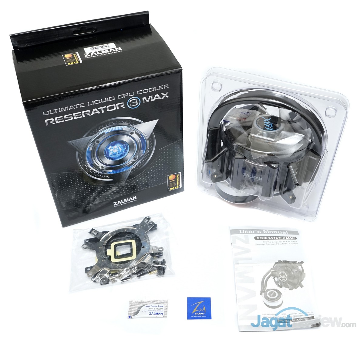 Paket penjualan Zalman Reserator 3 Max ini hadir dengan isi unit pendingin watercooling yang dilengkapi dengan radiator berdesain khusus ala Zalman, mounting kit Intel, mounting kit AMD, manual book dan stiker logo Zalman.