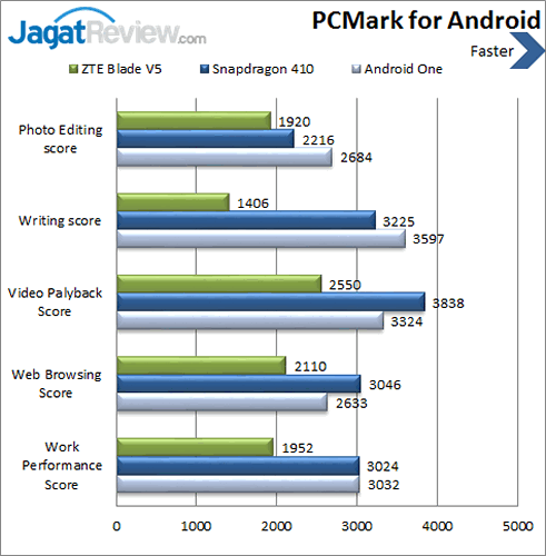 Kami telah melakukan pengujian daya tahan baterai dengan menggunakan aplikasi benchmark BatteryXPRT pada baterai ZTE Blade V5 yang memiliki kapasitas 2400 mAh. Pengujian kami lakukan berdasarkan setting default dari smartphone ini. ZTE Blade V5 yang satu ini mampu bertahan hingga 10 jam. Dalam pemakaian standar sehari-hari ada kemungkinan smartphone ini akan bertahan. Akan tetapi, dalam pemakaian berat bagi mereka yang sering menerima email, chatting, internet, dan sebagainya, ada baiknya untuk membeli sebuah powerbank untuk berjaga-jaga agar tidak kehabisan baterai.