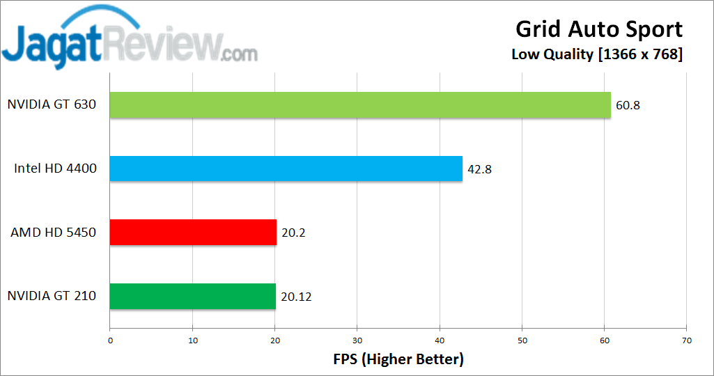 Di game balap yang sedang naik daun saat ini, GRID Autosport, kembali terlihat bahwa performa VGA murah sudah tidak lagi bisa diadu dengan Intel HD Graphics 4400 yang bisa didapatkan gratis di dalam Core i3 Haswell. Terlihat bahwa game ini bisa dijalankan dengan mulus di Intel HD Graphics 4400, tetapi tidak bisa mencapai 30 fps di GT 210 dan HD5450. GT 630, wakil VGA murah dari masa kini, tetap berhasil menunjukkan kelasnya dengan menjadi yang terbaik.