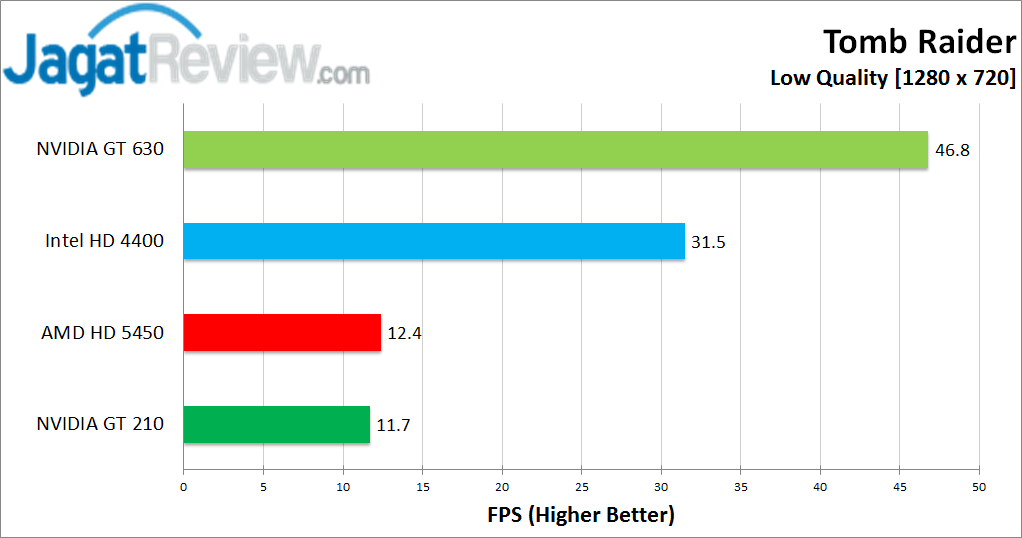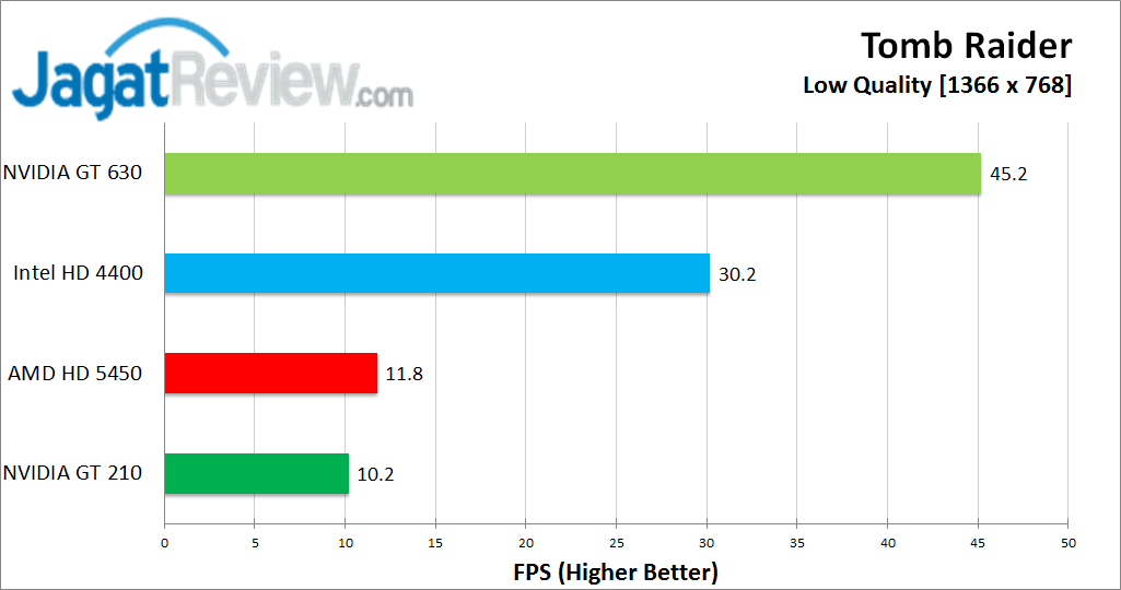 Di game Tomb Raider versi terbaru yang hadir pada tahun 2013 ini, posisi untuk performa empat GPU tersebut masih tidak berubah. Dua VGA murah gagal memberikan average fps di atas 30. Sementara untuk HD Graphics 4400 dan GT 630, keduanya berhasil melahap game ini dengan lebih baik dan memberikan framerate yang termasuk nyaman untuk gamer.