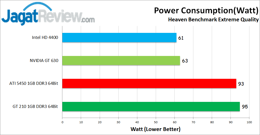 Meskipun memiliki performa yang lebih lambat dari Intel HD 4400, kedua graphics card tersebut, yaitu GT 210 dan juga ATI 5450 memiliki konsumsi daya yang lebih besar. Hal tersebut wajar mengingat arsitektur yang sudah uzur membuat graphics card tersebut terlihat sangat tidak efisien dalam segi performa/watt. Berbeda dengan GT 630, walaupun menjadi yang terkencang, namun GT 630 tetapi memiliki daya yang rendah dan hanya berbeda 2 watt saja dari Intel HD 4400.