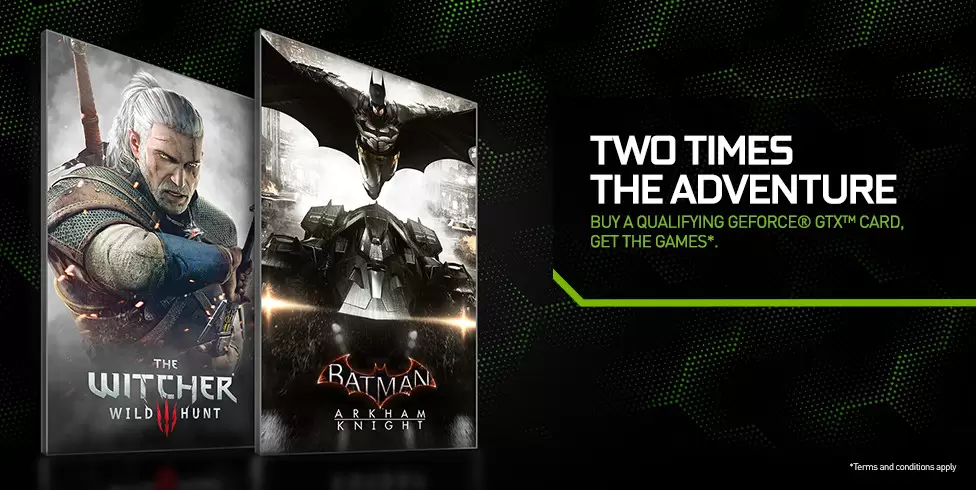 Game terkenal tersebut adalah The Witcher 3: Wild Hunt dan Batman: Arkham Knight. Kedua game tersebut memang belum dirilis secara resmi oleh developer game masing-masing, tapi antusiasme dari para gamer untuk menyambut game tersebut sangat lah besar. Oleh karena itu, NVIDIA mencoba memberikan keduanya secara gratis dalam paket Two Times Adventure ini.