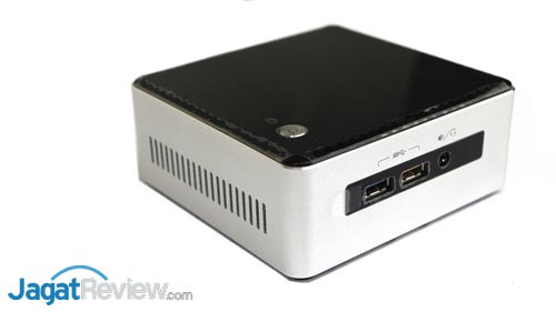 Bagian depan dari NUC ini diisi oleh dua buah port USB 3.0 dengan salah satunya berfungsi juga sebagai USB Charging Port. Terdapat juga audio jack untuk headphone atau microphone di dekat kedua port USB 3.0 tersebut. Intel juga menempatkan infrared sensor di bagian depan NUC ini untuk mendukung penggunaan infrared remote control oleh pengguna yang memanfaatkannya sebagai Home Theatre PC (HTPC).
