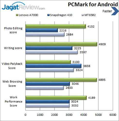 Kami telah melakukan pengujian daya tahan baterai dengan menggunakan aplikasi benchmark BatteryXPRT pada baterai Lenovo A7000 yang memiliki kapasitas 2900 mAh. Pengujian kami lakukan berdasarkan setting default dari smartphone ini. Smartphone yang satu ini mampu bertahan hingga 12,4 jam! Tentunya hal tersebut cukup baik untuk digunakan sehari-hari!