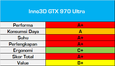 Inno3D GTX 970 Ultra menghadirkan performa yang tinggi digabungkan dengan sistem pendingin yang optimal dan dirangkum dalam sebuah produk yang memiliki perlengkapan berlimpah. Kekurangan yang kami temui hanya pada sisi ergonomi dari produk ini. Penggunaan sistem pendingin yang cukup besar membuat ukurannya menjadi sedikit tidak normal. Hal ini akan menimbulkan masalah apabila graphic card tersebut dipasangkan kedalam sebuah casing yang berukuran pas-pasan. Sebagai sebuah kesatuan produk, Inno3D menawarkan sebuah solusi menarik dalam sebuah paket yang menarik pula.