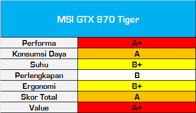 MSI mencoba menghadirkan sebuah alternatif murah dalam test perbandingan kali ini dengan hadirkan MSI GTX 970 Tiger Edition. Mengusung performa yang cukup kompetitif, sistem pendingin yang medioker dengan perlengkapan sederhana, menghasilkan sebuah produk yang mampu dibanderol dengan harga yang lebih miring dari Gaming Series. Kombinasi ini menghasilkan sebuah produk yang mempunyai price to performance tergolong baik di kelasnya.