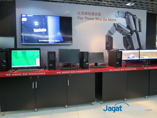 Kunjungan terakhir kami adalah menuju Customer Center Showcase, di mana pengunjung bisa melihat sekaligus mencoba berbagai lini produk dan solusi dari Lenovo. Dimulai dari produk smartphone, tablet, PC desktop, hingga ThinkServer dan simulasi data center.