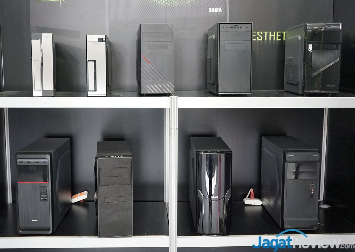 Setelah berbincang-bincang dengan pihak SAMA, kami pun langsung melihat-lihat lebih detail apa yang di dalam booth ini. Pada bagian depan booth ini, kami melihat jajaran casing SAMA dari berbagai tipe yang dipajang pada bagian booth ini.