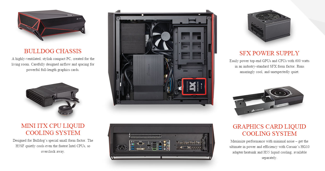 Corsair Bulldog pada dasarnya adalah sebuah PC Mini-ITX dimana user bisa memilih sendiri beberapa hardware tambahan yang ingin mereka benamkan di dalamnya. Dengan banderol USD 399, Bulldog menawarkan casing dengan gaya konsol yang telah dibekali motherboard ITX, H5SF CPU Liquid Cooler, dan fully modular SFX Power Supply 600 watt (Gold) dengan fan 92mm.