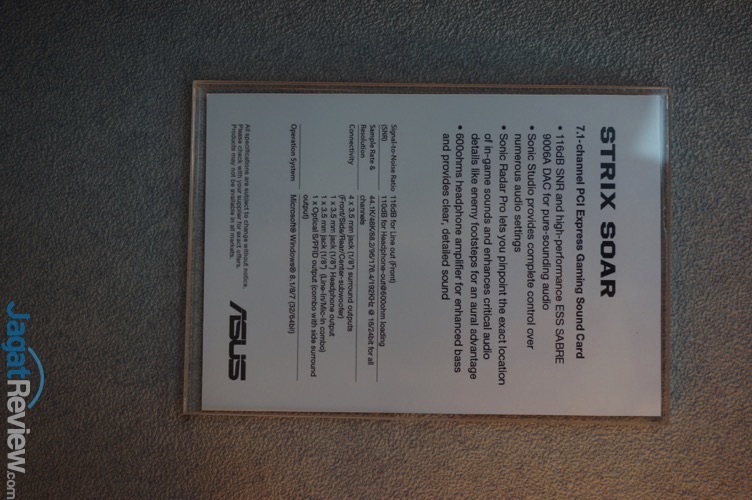ASUS sendiri langsung mengumumkan tiga buah Soundcard terbarunya tersebut. Strix Soar, adalah Soundcard paling “dasar” yang diciptakan ASUS di jajaran Strix. Soundcard tersebut sudah mendukung 7.1-Channel, 116dB SNR dan menggunakan chip ESS SABRE 9006A DAC yang sudah terkenal dikalangan para audiophile. Selain itu, fitur seperti Sonic Studio juga tidak lupa disematkan di Soundcard tersebut.