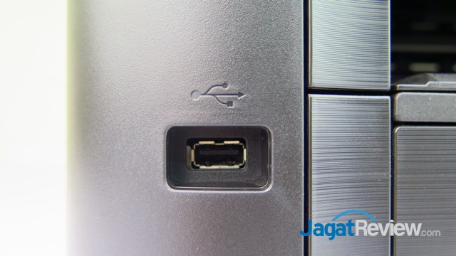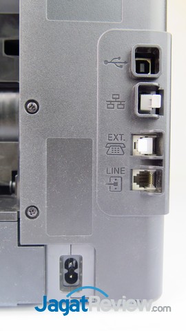Pada bagian kiri bawah printer, terdapat port USB yang bisa digunakan untuk mencolokkan flash drive dan melakukan proses print langsung dari flash drive tersebut. Untuk port pada bagian belakang terdapat port USB, port LAN, EXT, telepon dan port adapter.