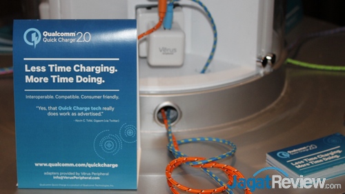 Untuk kemudahan penggunanya, perangkat dengan Snapdragon 810 mendukung charging cepat atau Quick Charge 2.0, dan wireless charging WiPower. Qualcomm menampilkan teknologi WiPower terbaru yang memungkinkan pengguna menyimpan perangkat charging di bawah meja, sementara perangkat yang akan di-charge diletakkan di atas meja. Quick Charge 2.0 akan kami bahas di artikel terpisah, sedangkan demo WiPower bisa Anda lihat pada video di bagian akhir artikel ini.