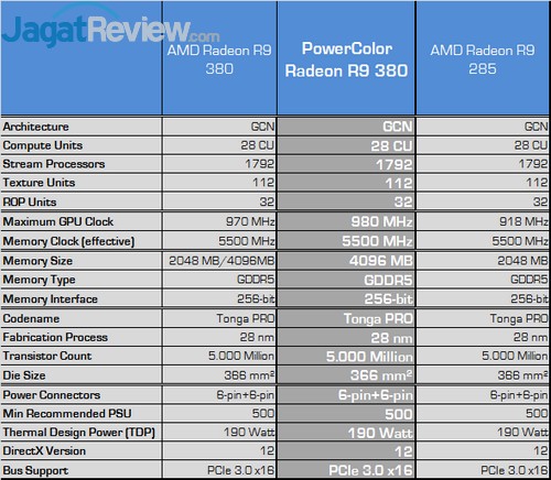 Secara umum, Radeon R9 380 ini adalah sebuah R9 285 yang memiliki clock GPU lebih tinggi. Terlihat semua spesifikasi sama, hanya saja penamaan chip GPU dan maximum GPU clock pada R9 380 mencapai 970 MHz, adalah dua hal yang membedakan R9 380 dengan R9 285. Untuk versi reference sendiri, terdapat dua tipe yakni versi reference dengan memori 2GB dan versi reference dengan memori 4GB. Sedangkan untuk PowerColor sendiri, mereka meningkatkan GPU clock 10MHz dari versi reference, peningkatan yang menurut kami terlalu rendah.