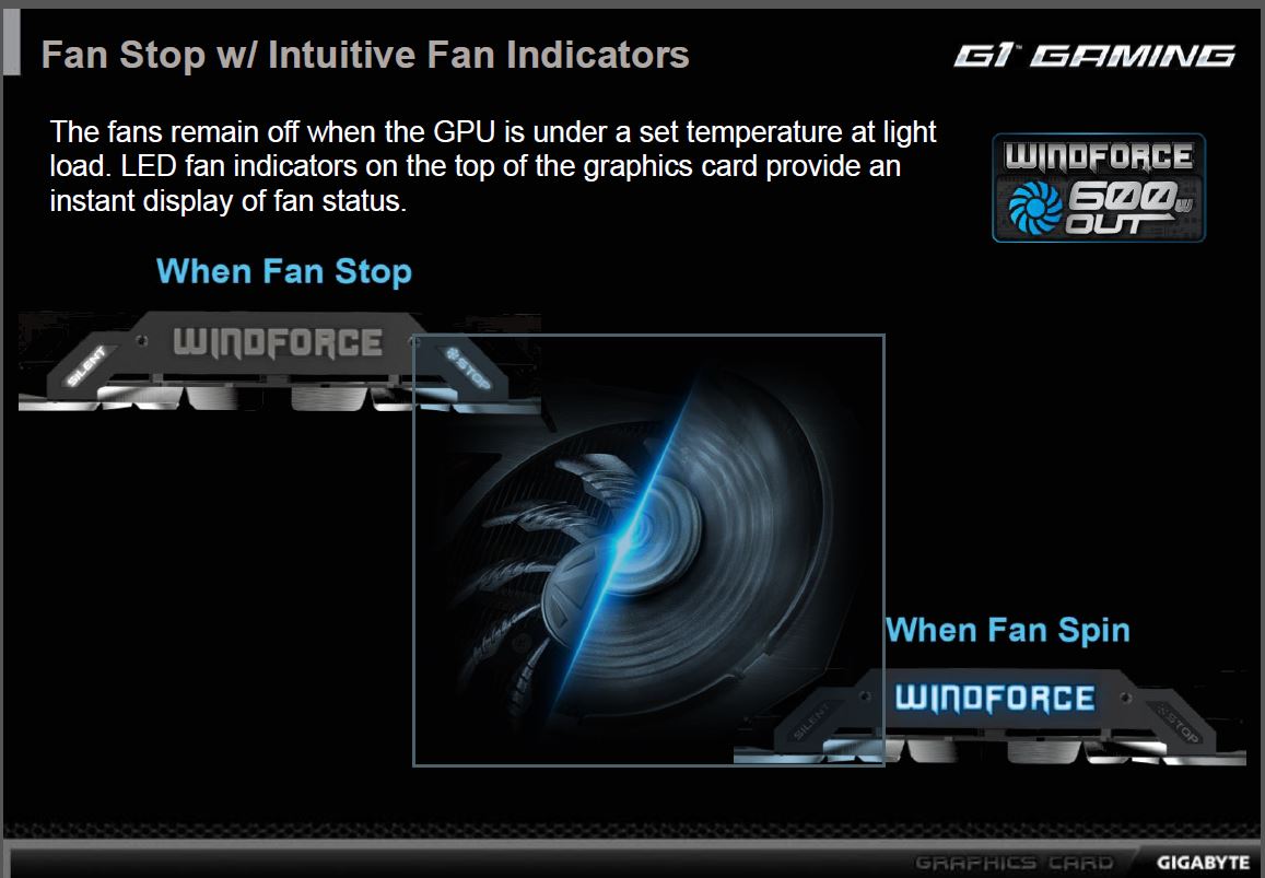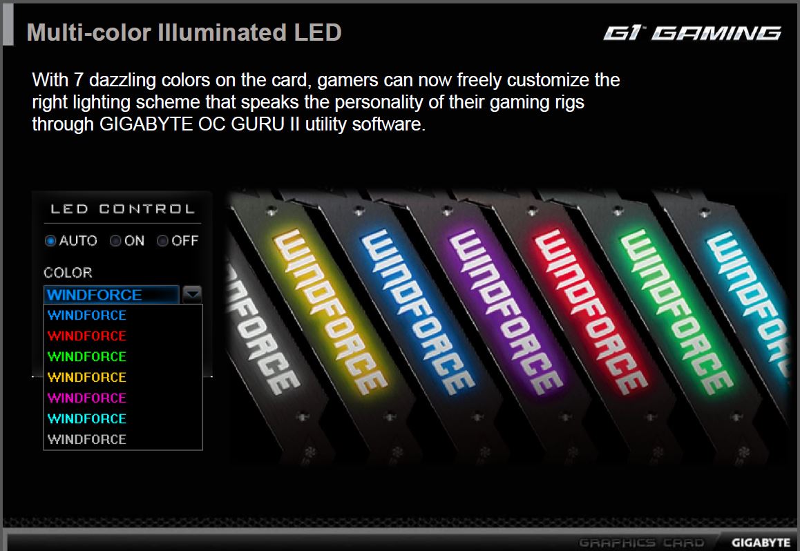 Pada sisi samping graphics card dapat ditemukan logo WINDFORCE yang akan memancarkan cahaya saat sistem dihidupkan. LED di balik logo tersebut ternyata tidak hanya bisa menampilkan warna biru saja, tetapi memiliki 7 variasi warna yang dapat Anda pilih melalui software mereka, yakni OC GURU II. Di sebelah kiri kanan perangkat juga terdapat indikator silent dan stop. Indikator tersebut akan menyala ketika idle ataupun load ringan yang tidak membuat fan dari graphics card tersebut berputar.