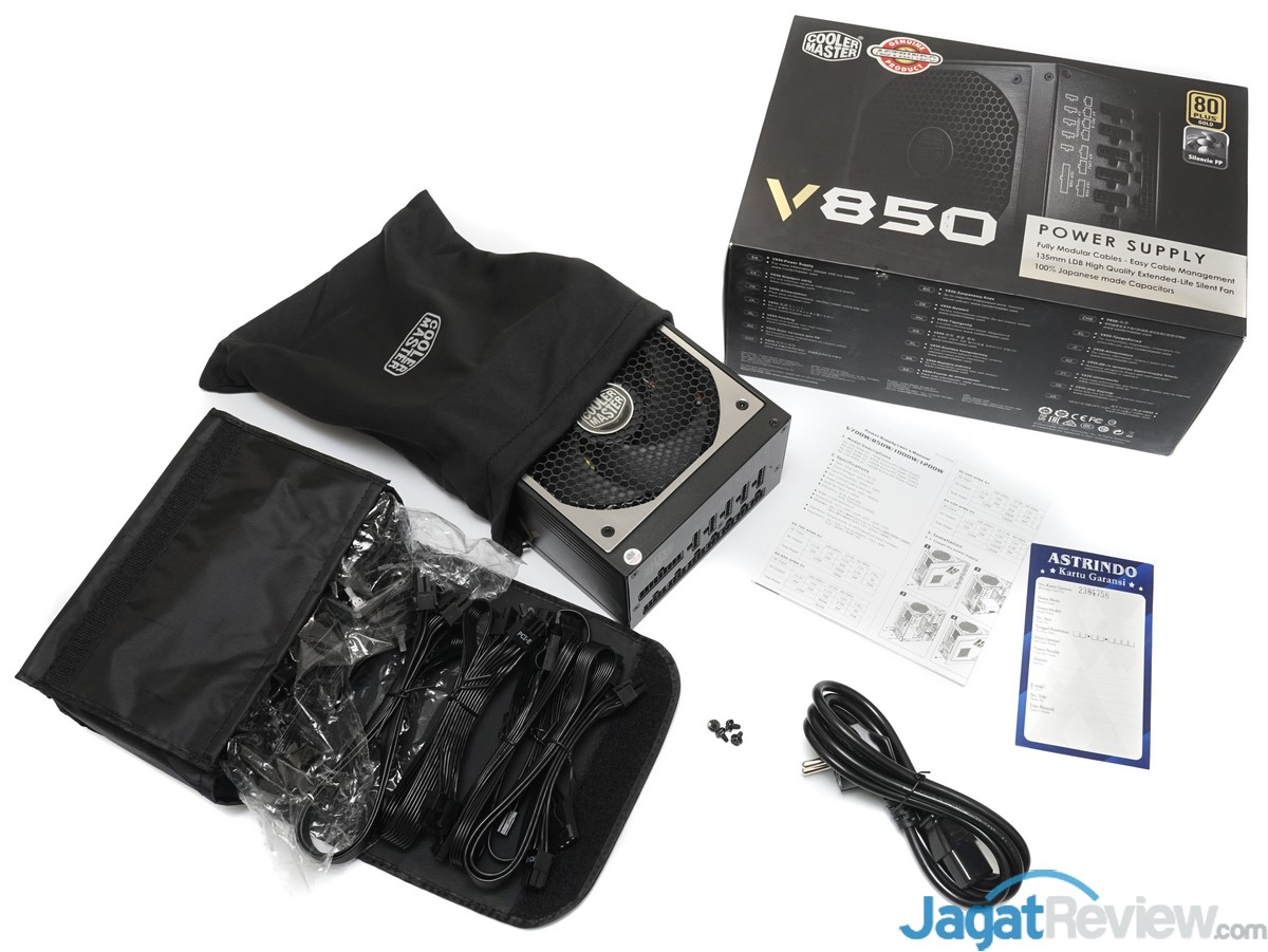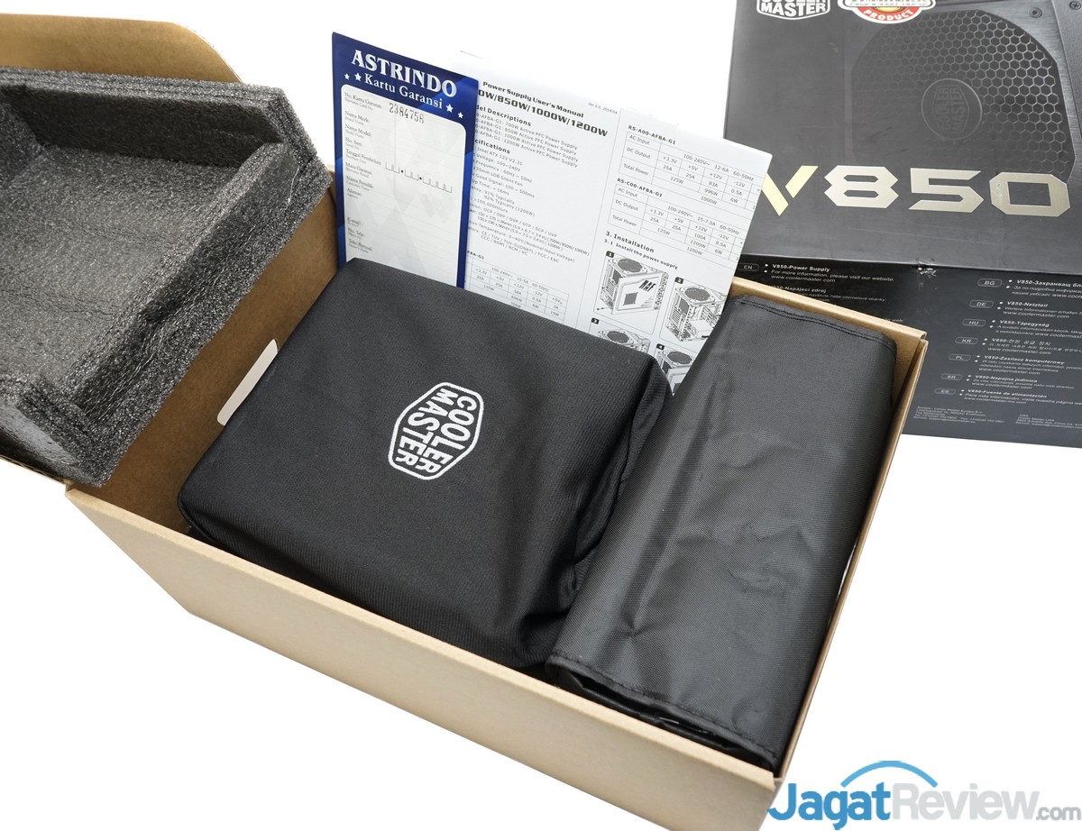 Paket penjulan CoolerMaster V850 ini hadir dengan aksesoris dan perlengkapan yang sederhana tetapi lengkap. Dalam paket penjualan PSU ini terdapat unit PSU, kantong PSU, kantong kabel modular, kabel AC, baut pengunci PSU, buku manual dan kartu garansi.