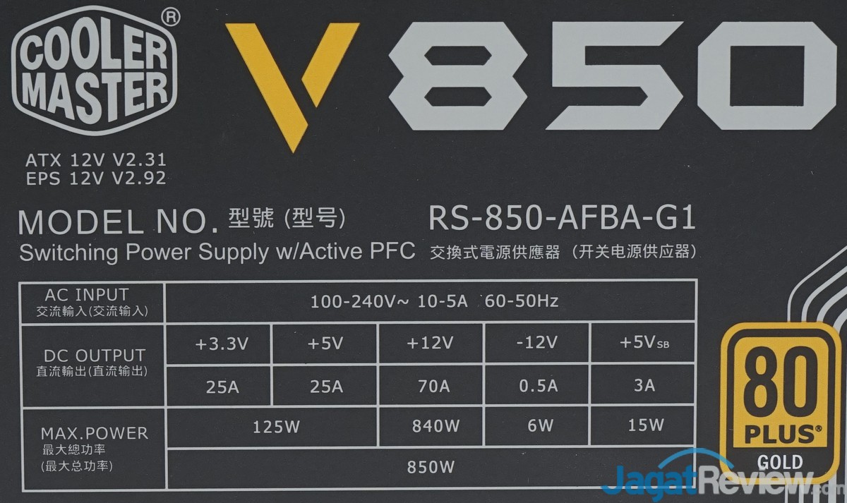 Inilah spesifikasi singkat dari PSU Cooler Master V850 sesuai yang tertera di kemasan perangkat.