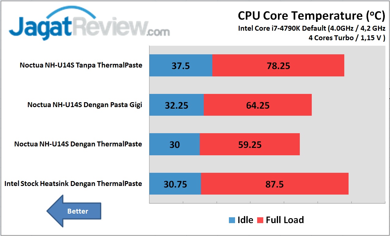 Jika dilihat lebih seksama lagi, penggunaan pasta gigi sebagai pengganti thermalpaste memang bisa menjadi opsi yang lebih baik dibandingkan dengan memasang heatsink tanpa menggunakan thermalpaste sama sekali. Dari data di atas dapat dilihat dengan jelas bahwa heatsink Noctua NH-U14S yang menggunakan pasta gigi memiliki performa pendinginan 14,00 oC lebih dingin dibandingkan dengan heatsink Noctua NH-U14S yang tidak diolesi thermal paste sama sekali.
