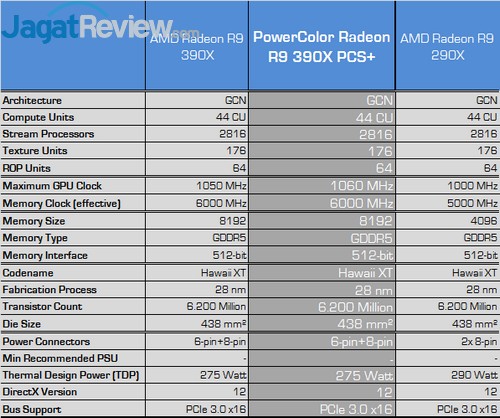 Secara spesifikasi, AMD R9 390X ini memiliki kemiripan dengan AMD R9 290X. Baik dari segi compute unit, stream processors dan texture unit. Hanya saja R9 390X memiliki 2x lipat kapasitas memori lebih besar dari R9 290X. Selain kapasitas memori, memory clock (effective) dari R9 390X sendiri meningkat 1000 MHz dari R9 290X, menjadi 6000 MHz. R9 390X juga memiliki clock lebih tinggi 50 MHz dari pendahulunya R9 290X, sedangkan Power Color menambahkan 10 MHz dari versi reference R9 390X menjadi 1060 MHz.
