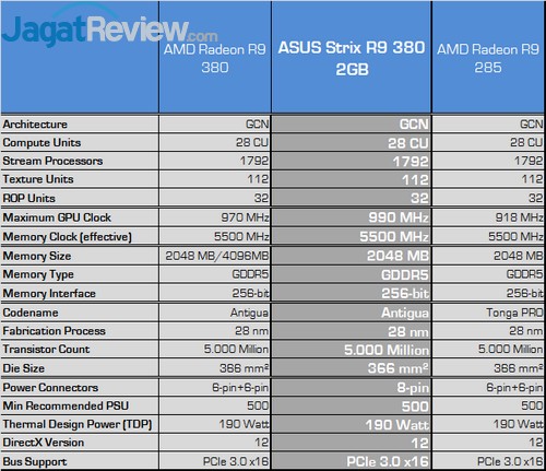 Peningkatan clock 20 MHz dari versi reference memang membuat ASUS Strix R9 380 sedikit lebih kencang walaupun tidak terlalu signifikan. R9 380 ciptaan ASUS ini memiliki kapasitas memori 2GB.