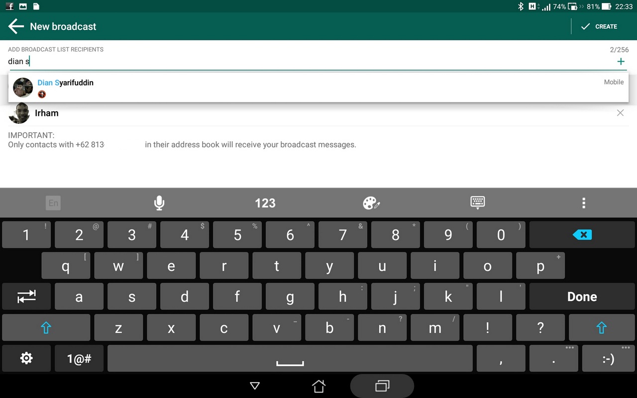 Catatan: hanya rekan yang memiliki nomer yang Anda gunakan di daftar kontak merekalah yang bisa menerima broadcast message Anda. Bila kebetulan ada rekan yang tidak memiliki nomer Anda, pesan Anda tidak akan tampil. Hal ini merupakan mekanisme pencegah spam dari WhatsApp.