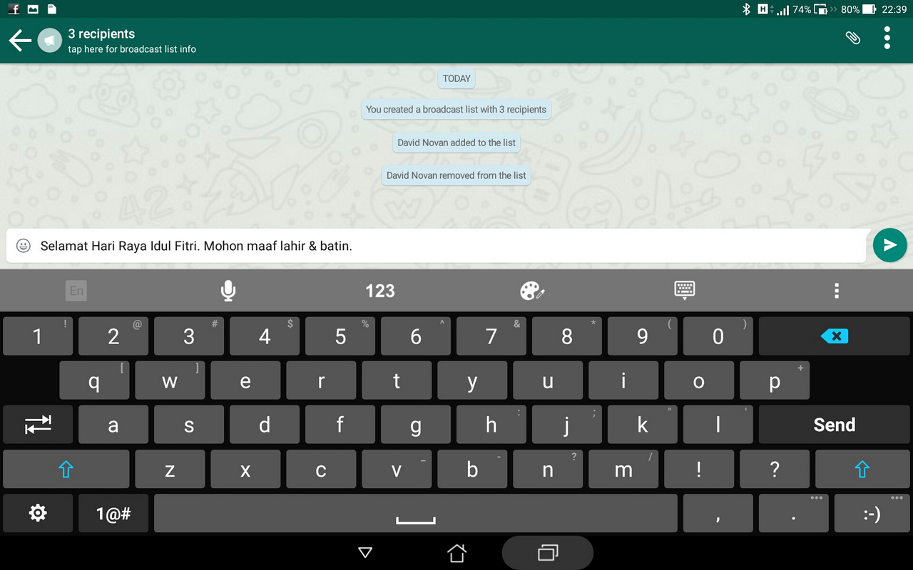 5. Ketika layar broadcast list terbuka, Anda bisa mengirim pesan layaknya ketika berbicara dengan rekan Anda