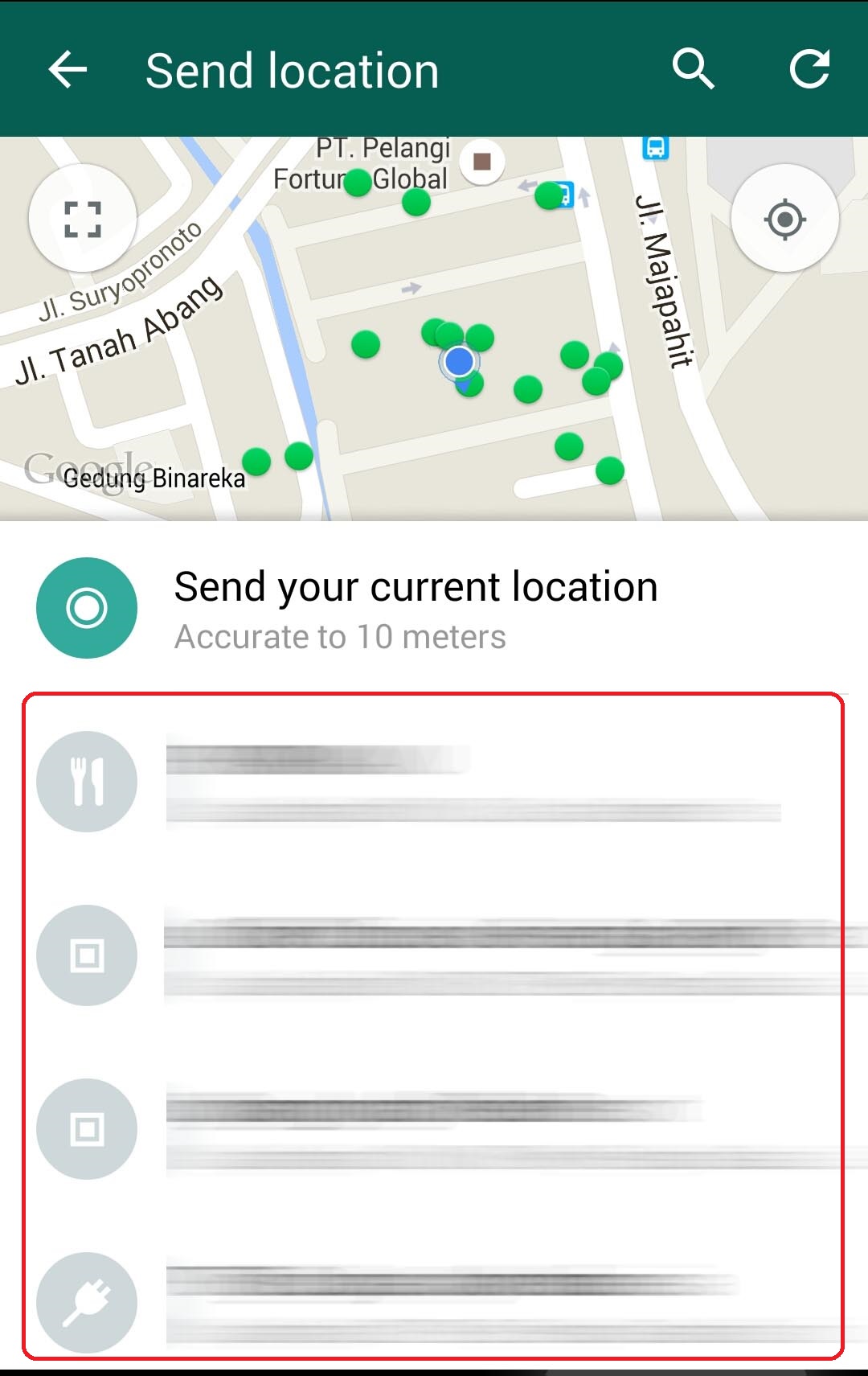 5. Setelah akurasi koordinat lokasi Anda sudah cukup baik, Anda bisa mengirim lokasi Anda ke lawan bicara dengan menekan tombol “Send your current location”.
