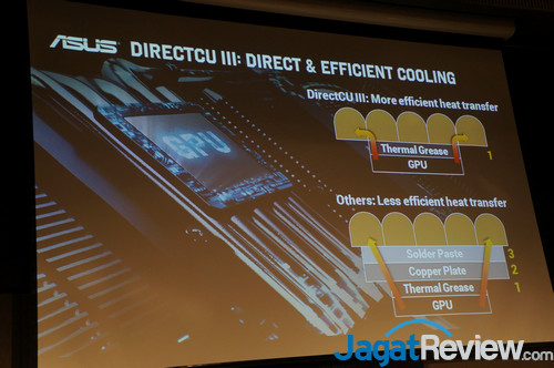 Mengawali sesi seminar, ASUS memberikan beberapa detail mengenai pendingin DirectCU III, yang dipasang pada lini VGA STRIX. Cooler tersebut dipercaya bisa memberikan solusi thermal yang baik bagi berbagai GPU high-performance AMD dan NVIDIA yang akan datang. ASUS pun memberikan sebuah utility ‘Game Booster’ pada software tuningnya, yang diklaim bisa meningkatkan performa dan responsiveness.