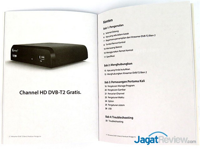 Di dalam kotak, tersedia satu buah perangkat Xtreamer DVB-T2 Bien2, satu buah kabel HDMI, satu buah Remote untuk perangkat tersebut, juga disediakan dua buah baterai untuk Remote dan buku petunjuk penggunaan dalam bahasa Inggris dan bahasa Indonesia.