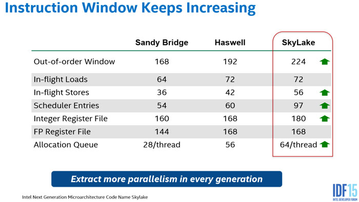 Kunci kinerja lebih kencang dari Skylake adalah kemampuan core yang ditingkatkan dari generasi prosesor Intel sebelumnya. Prosesor Skylake memiliki desain core yang lebih “lebar”, sehingga kapasitas memproses instruksinya lebih tinggi. Ini akan berimbas pada performa yang lebih baik di clock yang sama (instruction per clock yang lebih tinggi).