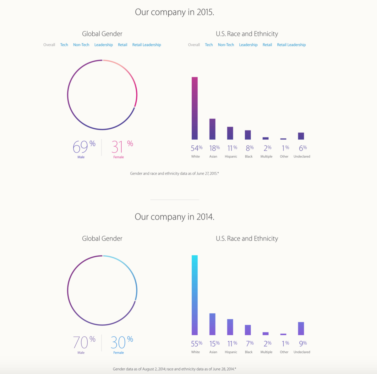 Dalam laporan keragaman tersebut untuk pegawai global Apple membagi dalam jenis kelamin pria dan wanita. Sedangkan untuk etnis Apple merinci kulit hitam dan etnis Hispanik untuk Amerika Serikat dengan alasan di negara tersebut lah sebagian besar para pegawainya tersebut tinggal.CEO Apple,Tim Cook, menyatakan bahwa kini Apple memiliki 114 ribu pegawai yang tersebar di seluruh dunia. Dari jumlah tersebut 69% berjenis kelamin pria dan 54% berkulit putih. Dibandingkan pada tahun 2014, peningkatan yang dilakukan Apple terbilang kecil karena tahun lalu jumlah pegawai pria Apple sebanyak 70% dengan 55% berkulit putih.