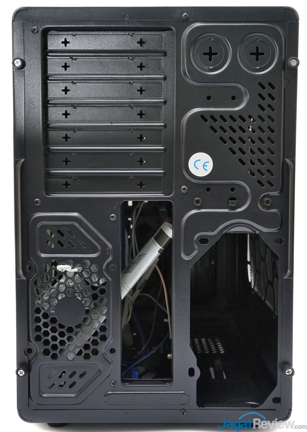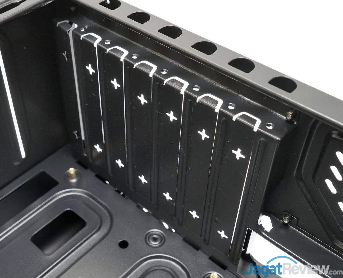 Penutup slot PCI-E pada casing ini menggunakan penutup permanen. Sehingga pengguna harus mematahkan penutup tersebut. Sekali dipatahkan, penutup ini sudah tidak dapat dipasang kembali lagi ke posisi semula.