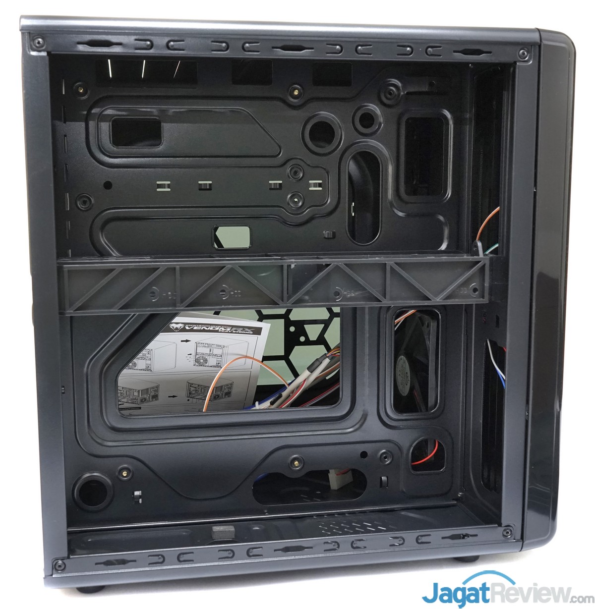 Casing venomRX Omega ini memiliki dua buah ruangan utama yang terpisah, dimana komponen utama PC seperti prosesor, VGA Card, RAM dan motherboard diletakan di ruang kanan. Casing ini juga terlihat dilengkapi dengan fitur cable-management. Anda dapat melihat beberapa lubang cable-management yang ada pada bagian tray-motherboard casing ini. Selain itu terlihat juga, bahwa VenomRX hanya memberikan 1 unit fan bawaan berukuran 120mm ke dalam paket penjualan casing ini yang diletakkan di bagian depan casing.