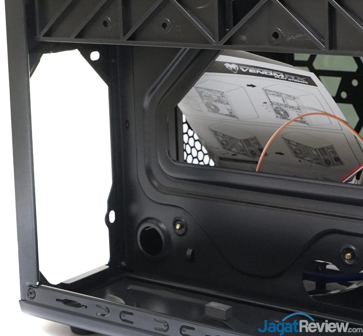 Setelah selesai melihat ruangan kanan casing venomRX OMEGA, mari kita beralih melihat ruangan kiri casing ini yang akan menampung komponen power-supply (PSU), storage harddisk / SSD dan optical drive.