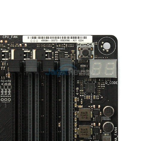 Terdapat tombol power on/off, reset, Clear CMOS, dan juga MemOK. Terdapat pula 2-digit Debug LED untuk informasi cepat mengenai kondisi sistem.