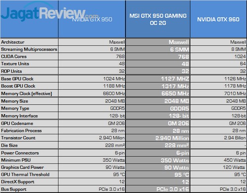 NVIDIA menggunakan 6 SMM pada GTX 950, yang berarti berbeda 2 SMM dengan GTX 960. Cuda Cores-nya sendiri berjumlah 768, Texture Units 48 buah dan juga ROP Unit 32 buah. Chip yang digunakan juga mirip dengan GTX 960, yakni GM 206.