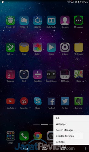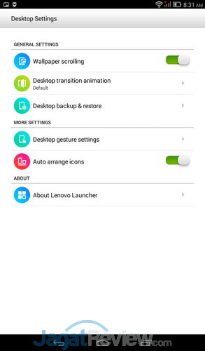 Ada pula Desktop Setting yang memungkinkan pengaturan seperti wallpaper scrolling, desktop transition animation, desktop backup and restore, dan masih banyak lagi. Soal aplikasi bawaan, Lenovo menyediakan WPS Office, UC Browser HD, SYNCit HD, SHAREit, dan game Tap the Frog.
