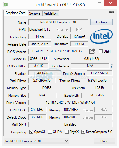 Sedangakan untuk spesifikasinya, Intel HD 530 pada Core i7 6700K tak akan sekencang IGP Intel Iris Pro 6200 pada prosesor Broadwell. Intel HD 530 memiliki 24 EU (Execution Unit), separuh IGP Broadwell dengan clock speed di angka 1150MHz. Memang jika Anda melihat spesifikasi aplikasi GPU-Z yang kami tunjukan, masih terdapat kesalahan baca aplikasi tersebut.