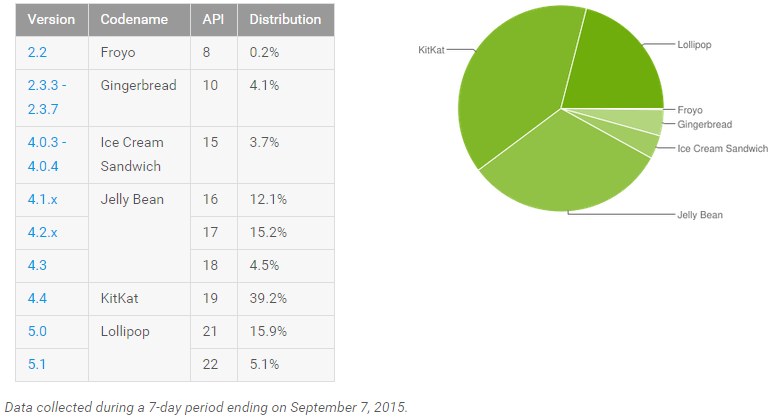 Untuk adopsi Android sendiri posisinya masih sama dimana KitKat masih menduduki posisi nomor satu, Jelly Bean nomor dua, Lollipop nomor tiga, Gingerbread nomor empat, Ice Cream Sandwich nomor lima, dan Froyo di nomor enam. Nampaknya posisi kedua dari Lollipop ini tidak akan lama dan akan segera menyalip KitKat karena perbedaannya yang tidak begitu besar. Sementara ini Google juga masih menggodok Android terbaru, Marshmallow yang tak lama lagi akan diluncurkan bersamaan dengan piranti Nexus terbaru.