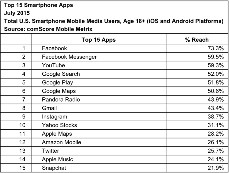 Dalam laporan comScore tersebut, dipaparkan 15 aplikasi smartphone terpopuler untuk bulan July 2015 kemarin, dengan sumber partisipan adalah pengguna sosial media di smartphone Android dan iOS yang berusia 18 tahun ke atas. Hasilnya, Facebook dan Facebook Messenger berhasil menduduki posisi teratas.