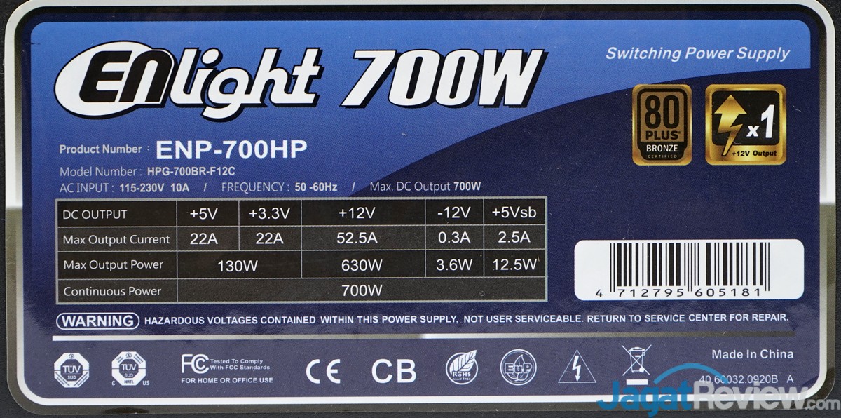 NB: Bagi yang masih merasa kebingungan dan mempertanyakan ke-absahan atas sertifikasi 80+ bronze dari PSU Enlight “ENP-700HP” yang pada dasarnya tidak ada di dalam database website 80plus.org ( plugloadsolutions.com ), Anda dapat mencari bukti ke-absahan sertifikasi 80+ Bronze PSU ini dengan menggunakan kode produk: HPG-700BR-F12C yang tertera pada label spesifikasi PSU Enlight “ENP-700HP” ini yang sebenarnya menggunakan OEM dari salah satu produsen PSU OEM “High Power Electric Co., Ltd.”