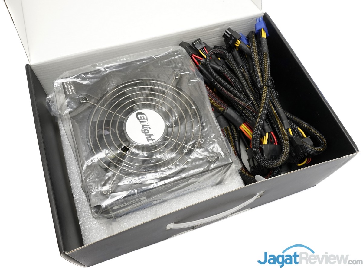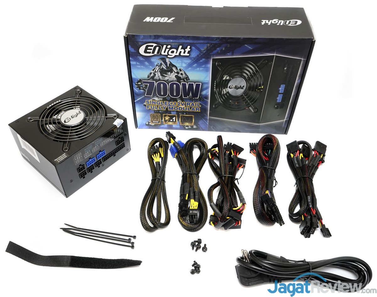 Paket penjualan Enlight “ENP-700HP” ini terbilang cukup sederhana dengan kelengkapan dan aksesoris minimalis untuk sebuah PSU Full-modular. Dalam paket penjualannya, hanya terdapat satu unit PSU, kabel modular, kabel AC, cable-tie, cable-strap, baut pengunci PSU dan baut thumbscrew. Cukup disayangkan pada sample PSU yang kami terima ini, kami tidak menemukan buku manual untuk produk PSU ini.