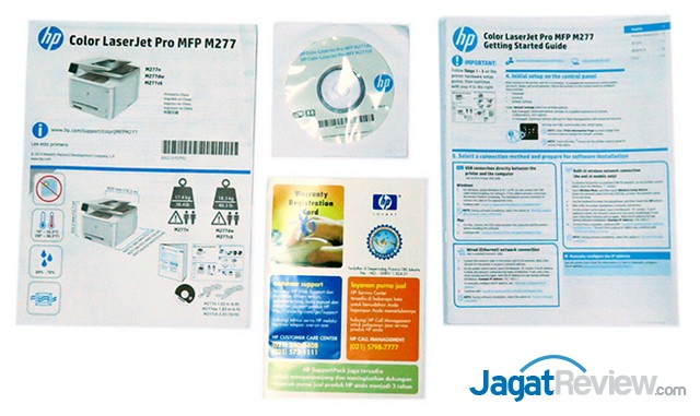 Paket penjualan dari HP Color LaserJet Pro MFP M277 dw ini tergolong lengkap dengan isi box berupa printer HP Color LaserJet Pro MFP M277 dw, HP 201A Black Original LaserJet Cartridge (~1500 yield) dan Introductory HP LaserJet Color cartridges (~700 color composite (C/Y/M) yield), panduan instalasi, CD-ROM berisi software pendukung dan dokumen printer, kabel power, dan kabel USB.