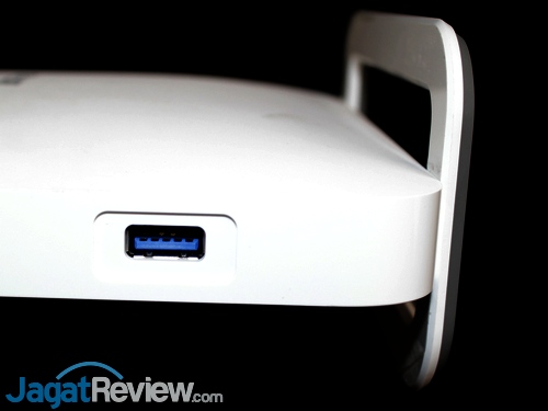Untuk penggunaan perangkat berbasis USB sendiri, posisi dari port USB 2.0 di bagian belakang cukup tinggi dari dasar perangkat saat diposisikan dalam posisi standar. Hal ini tentu saja membuat port ini kurang cocok untuk memasang HDD eksternal, terutama untuk yang hanya dilengkapi kabel pendek. Untuk USB flash drive atau printer, tentu saja port ini bisa digunakan. Sementara untuk port USB 3.0, karena letaknya masih cukup dekat ke bagian dasar, port ini seharusnya masih mudah dijangkau oleh kabel dari HDD eksternal.