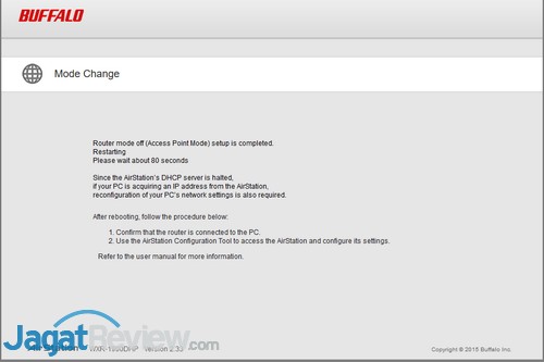 Berdasarkan beberapa kali percobaan yang kami lakukan, saat switch mode konfigurasi berada di “Auto”, mode operasi dari router pun turut ditentukan secara otomatis. Karena jalur Internet yang biasa kami gunakan mengusung pembagian IP dinamis (DHCP) secara otomatis, router ini langsung mengkondisikan dirinya sebagai Wireless Access Point, sekalipun switch mode operasi berada di “Router”. Hal ini terus terjadi sekalipun ketika kami telah melakukan factory reset pada perangkat. Tampaknya Buffalo memang menanamkan konfigurasi otomatis seperti itu ke dalam router WXR-1900DHP ini.