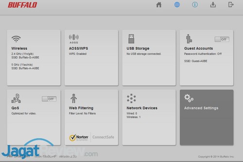 Dashboard dari WXR-1900DHP ini mengusung desain yang serupa dengan berbagai produk Buffalo lain yang dirilis dalam beberapa tahun terakhir ini. Pengguna bisa mengakses secara cepat menu konfigurasi beberapa parameter dasar dari tampilan utama. Sementara untuk beberapa konfigurasi lain yang lebih detail, Buffalo menyediakan menu “Advanced Settings”. Hanya saja, untuk penguna yang lebih familiar dengan desain dashboard router lawas dari Buffalo, desain baru ini akan terlihat jauh berbeda.
