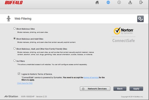 Fitur Web Filtering, hasil kerja sama Buffalo dengan salah satu penyedia solusi keamanan ternama, Norton, juga tersedia. Hal ini membuat pengguna bisa dengan mudah melakukan blokir terhadap situs-situs yang dirasa tidak pantas diakses. Fitur ini juga akan membantu mengidentifikasi web bermasalah dengan mudah, dan otomatis melakukan pemblokiran akses.