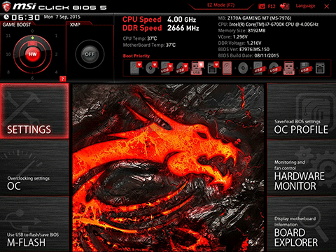 Pada motherboard 100-Series, khususnya pada GAMING-Series ini, MSI membekali jajaran motherboardnya dengan BIOS UEFI baru yang bernama Click BIOS 5. Memang jika dilihat sekilas Anda tak akan merasakan perbedaan yang signifikan antara Click BIOS 5 dan Click BIOS 4 terkecuali background naga merah yang dominan. Namun, pada Click BIOS 5 kini MSI berhasil memberikan antarmuka yang lebih responsif saat dinavigasikan.