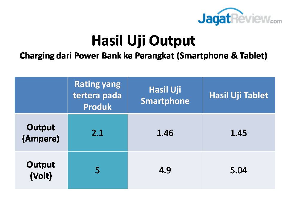 Pengujian kami kali ini adalah dengan menggunakan perangkat untuk mengukur besar arus yang dialirkan ketika melakukan proses charging, baik charging ke perangkat maupun power bank. Perlu diketahui bahwa input dan output yang terdapat pada power bank merupakan arus maksimal yang bisa dihasilkan, sehingga tidak berarti power bank yang ada mampu mengalirkan arus sebesar rating yang telah dicantumkan.